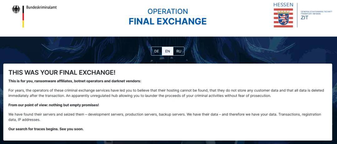 据悉,被查封的交易所包括Xchange.cash(超过40万用户)、60cek.org(超过30万用户)、Baksman.com(28万用户)、Prostocash.com(26万用户)以及其他一些较小的平台,这些交易所的网站现在显示了德国政府的明确警告:“我们找到了他们的服务器并没收了开发服务器、生产服务器、备份服务器。我们掌握了他们的数据,自然我们也掌握了你们的数据:交易、注册资料、IP位址。我们开始搜寻踪迹。很快再见。”