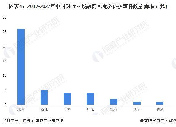 根据IT桔子,从融资事件的发生地点来看,目前北京的融资事件最多,2017年至2022年累计达26起。而浙江、上海、广东银行业投融资事件相比北京而言数量均较小,2017年至2022年,三省市投融资事件数量分别为5件、4件、4件。
