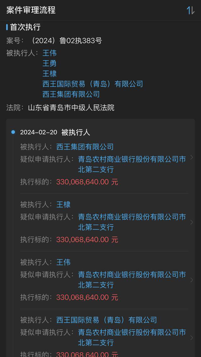 据中国执行信息公开网消息,2月20日,西王集团有限公司、西王国际贸易(青岛)有限公司、王勇、王棣、王伟被青岛市中级人民法院执行超3.3亿。根据青岛市中级人民法院公布的限制消费令,该案申请人为青岛农村商业银行股份有限公司市北第二支行,案由为借款合同纠纷。