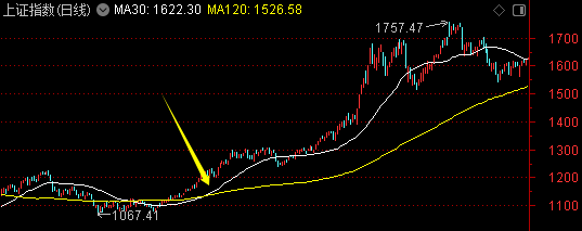 此外,从30日均线与年线(250日均线)来看,目前30日均线已经上穿年线,而且年线已经拐头向上。就这个特征,我们来看看历史上几轮牛市当时的情况。