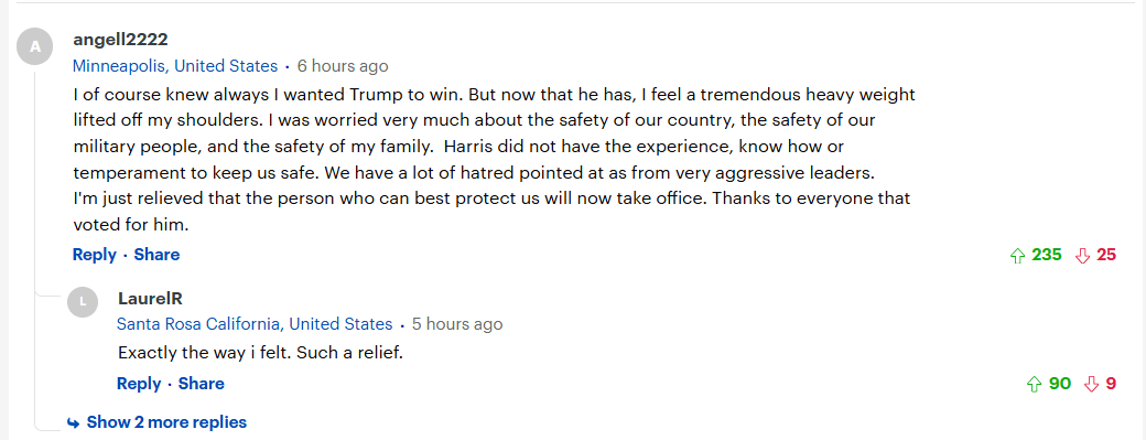 有意思的是新闻评论区里清一色都是对特朗普的支持,也许是因为支持哈里斯的选民难过到还不愿意动手指评论,又或许是如美国网友所说特朗普的“红色浪潮”(red tsunami)早已席卷美国大地……