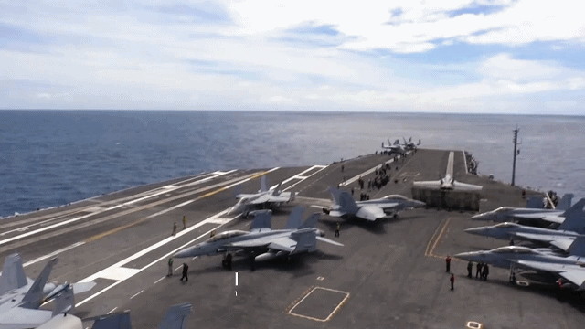 左舷整备区放飞完毕后,开始放飞舰艉整备区的飞机,在舰艉整备区的飞机放飞完毕后,开始放飞右舷靠近舰岛整备区的飞机,所有的飞机都遵循最短的行进路线,自主滑行向起飞线实施放飞。从视频中看,可以放飞12架战斗机,放飞完毕后,剩下两架舰岛旁的舰载机,作为备用机。