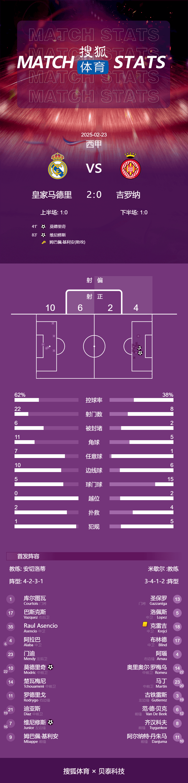 北京时间2月23日晚23:15分,2024-2025赛季西甲第25轮的一场大战打响,西甲豪门皇马在主场对战赫罗纳。上半场比赛,莫德里奇禁区外世界波破门。下半场比赛,维尼修斯得分。全场比赛结束,皇马在主场2-0赫罗纳,取得近4轮联赛首胜,积分追平榜首巴萨,因净胜球劣势排在第二位。