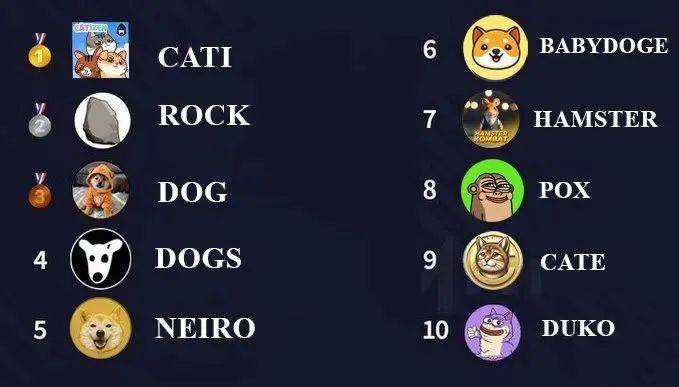 从时间角度,9月16日上线的三个meme币(100000babydoge,NEIRO,TURBO),热度已经开始减弱了,人们的目光开始转移到了CATI之上,因此它们的币价也在开始回落,很好地印证了前文的观点。