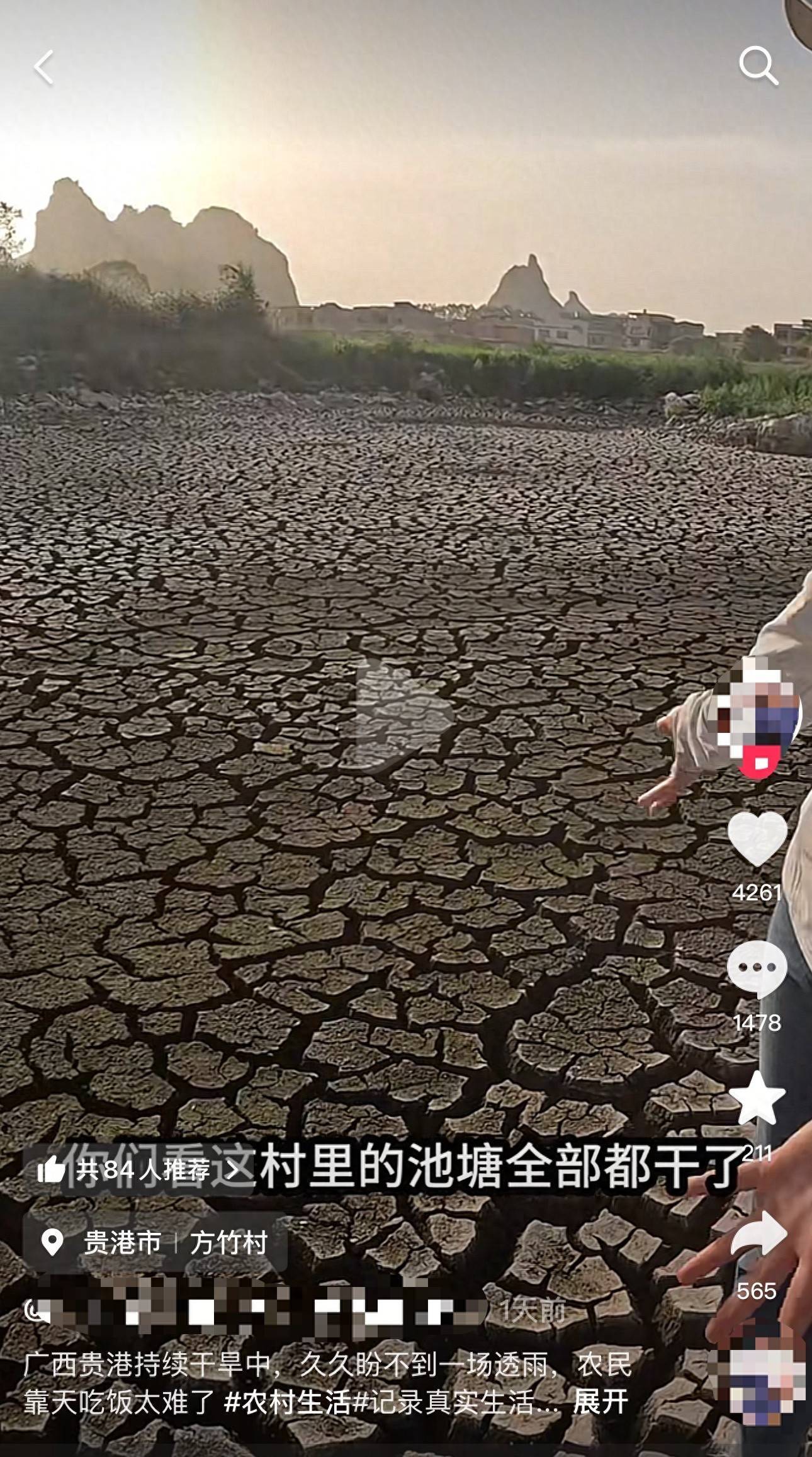 近日,广西贵港市农村地区持续干旱引发关注。该市覃塘区石卡镇方竹村一村民拍摄的视频显示,村里的池塘已经完全干涸,地表布满拳头大小的裂缝。