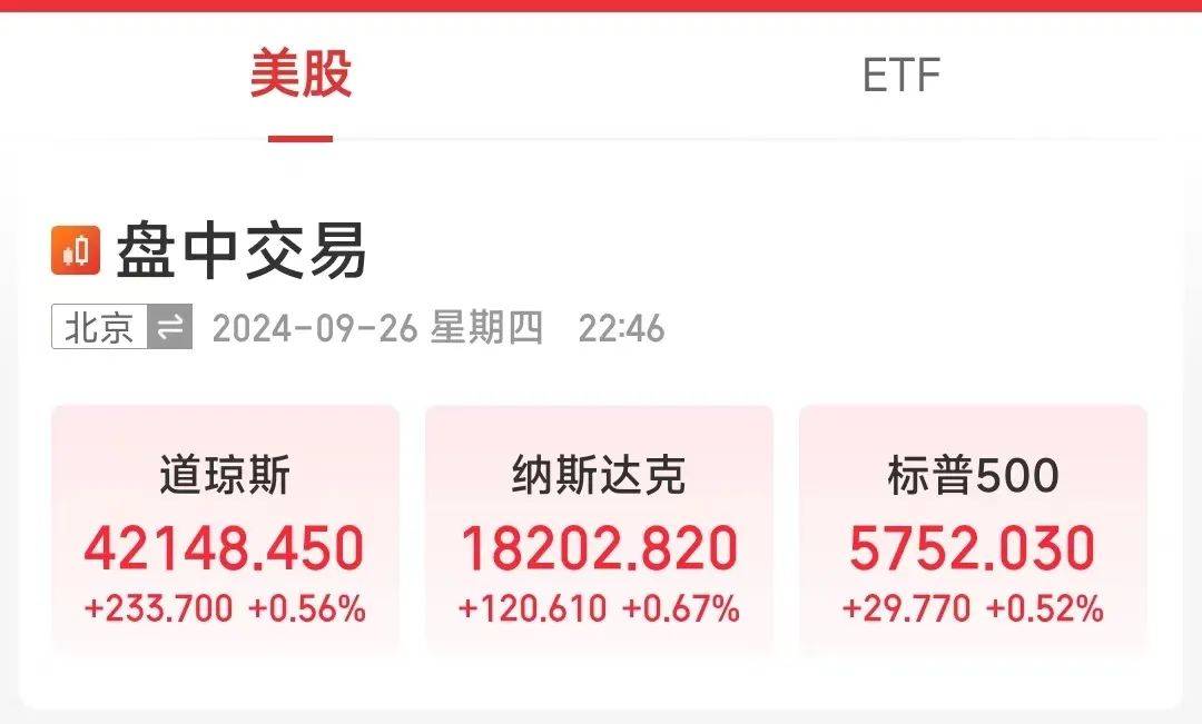 9月26日,美股三大指数集体高开,道指涨0.56%,纳指涨0.67%,标普500指数涨0.56%。
